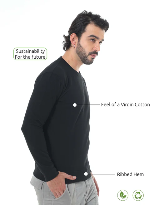 This premium sustainable sweatshirt is designed for everyday comfort while supporting a greener planet. Made using 60% recycled cotton and 40% recycled PET bottle scrap, it offers the soft, smooth feel of virgin cotton without compromising on durability. The fabric is crafted through an eco-efficient process that uses 90% less water, 20% less power, and zero dyes or harsh chemicals, making it an ideal choice for conscious consumers and responsible brands.