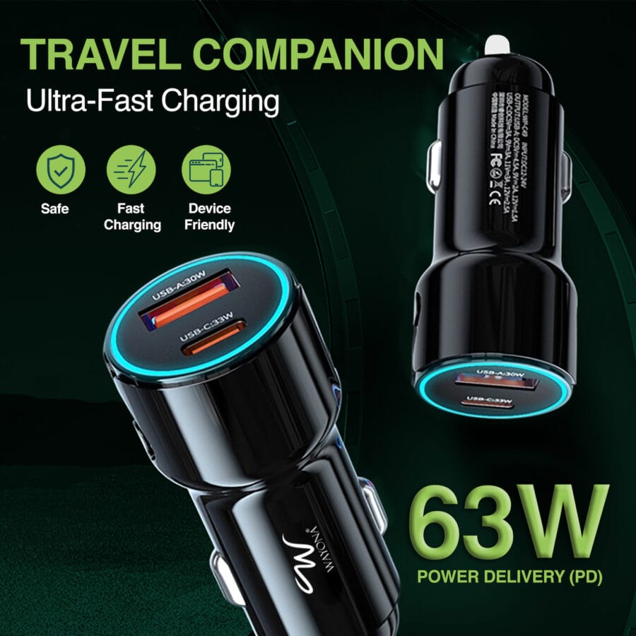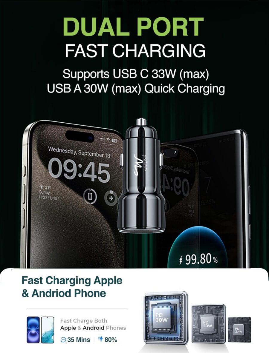 The Wayona Car Zapcharge PD is a powerful and efficient car charger designed for modern corporate users who rely on fast charging while traveling. With a total output of 63W, it supports Power Delivery (PD) and Quick Charge technology, making it suitable for mobile devices, tablets, and accessories that require high-speed charging. Its dual-port design includes a USB-A 30W and USB-C 33W output, allowing simultaneous charging without compromising performance.