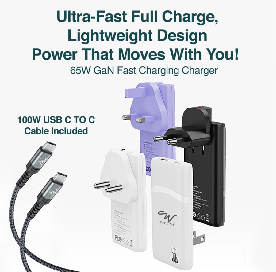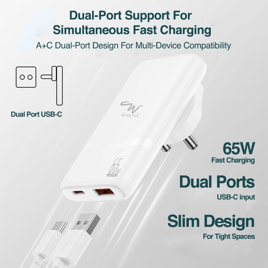 65W USB C Fast Charger: 3x faster than the original 5W charger. Supports a maximum output of 65W. Contains 1 USB-C port (65W max) and 1 USB-A port (22.5W max). Provide high-speed charging for your phone, laptop or tablet all at once with a single charger. Perfect for home, office and travel.