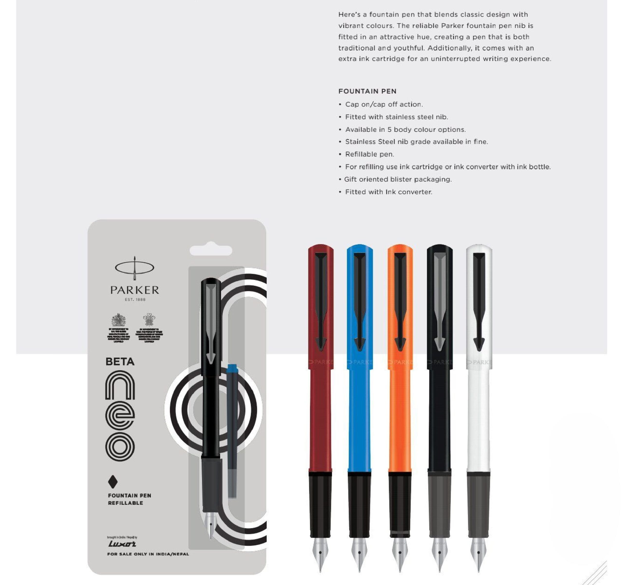 The Parker Beta Neo Fountain Pen is designed for organizations seeking a refined, durable, and high-performance writing instrument for bulk procurement. Blending classic fountain pen aesthetics with modern vibrant colors, it features a stainless-steel nib engineered for smooth and consistent writing. The coated clip and molded body enhance durability while maintaining a premium appearance suitable for corporate gifting and employee use. Available in five body color options, the Beta Neo offers choice and flexibility for branding and distribution. The pen is refillable and supports both ink cartridges and converters, making it cost-efficient for long-term usage. Each unit comes with an ink converter included, ensuring uninterrupted writing right from the first use. Packed in a gift-oriented blister pack, this fountain pen delivers both presentation value and functionality, making it ideal for conferences, corporate hampers, and professional office needs.