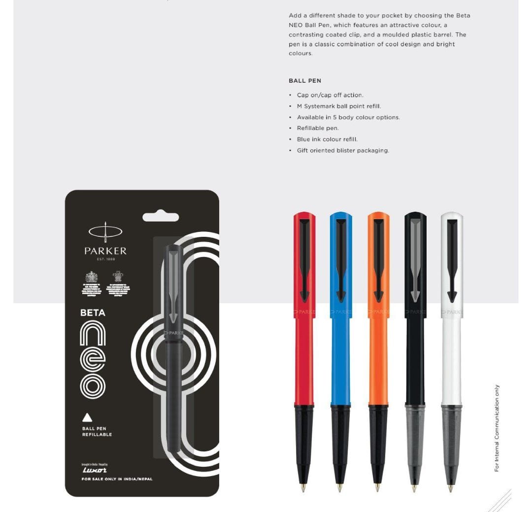 The Parker Beta Neo Roller Ball Pen is designed to offer smooth writing performance with an attractive molded plastic body and a contrasting coated clip. Equipped with Navigator “X” roller ball refill technology, it delivers consistent ink flow suitable for daily office use, gifting, and branding. Available in five vibrant body colors, the pen combines durability, reliability, and premium aesthetics, making it an excellent choice for corporate procurement and mass distribution.