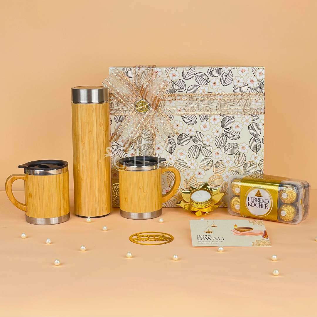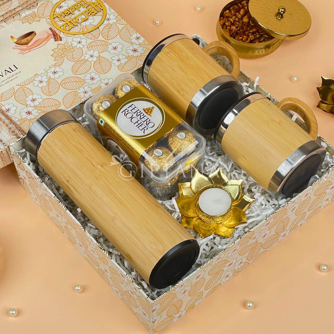 Festive Corporate Diwali Gift Hamper – Bamboo Bottle, Mugs & Chocolates