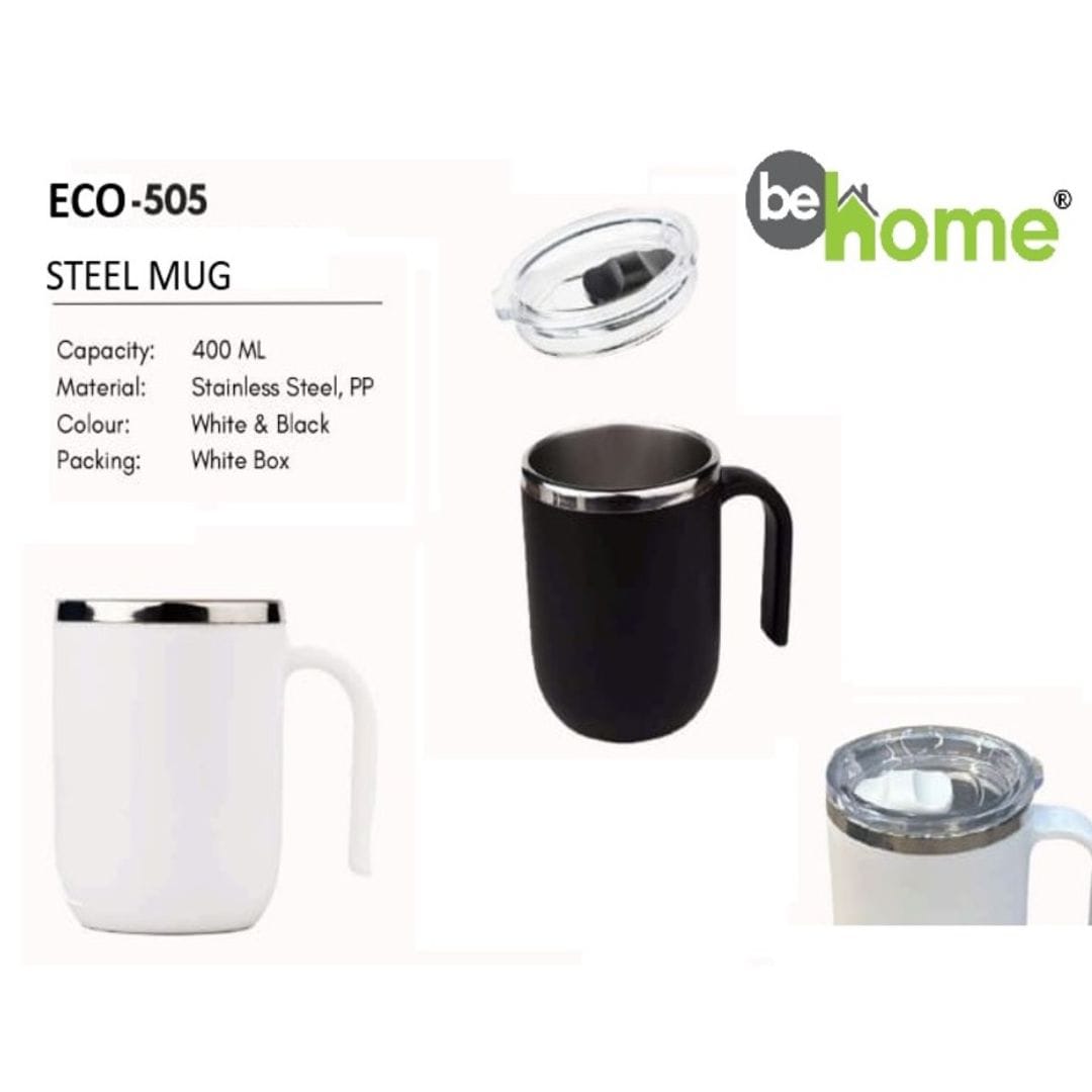A ECO-505 steel mug, 400ml stainless steel mug, white & black mug, behome steel mug, office coffee mug, travel mug, home beverage mug, leakproof steel mug, durable steel mug, corporate gifting mug, promotional steel mug, reusable steel mug, premium hydration mug, branded steel mug, lifestyle gifting mug, PP handle steel mug, portable steel mug, daily use steel mug, eco-friendly mug, modern steel mug