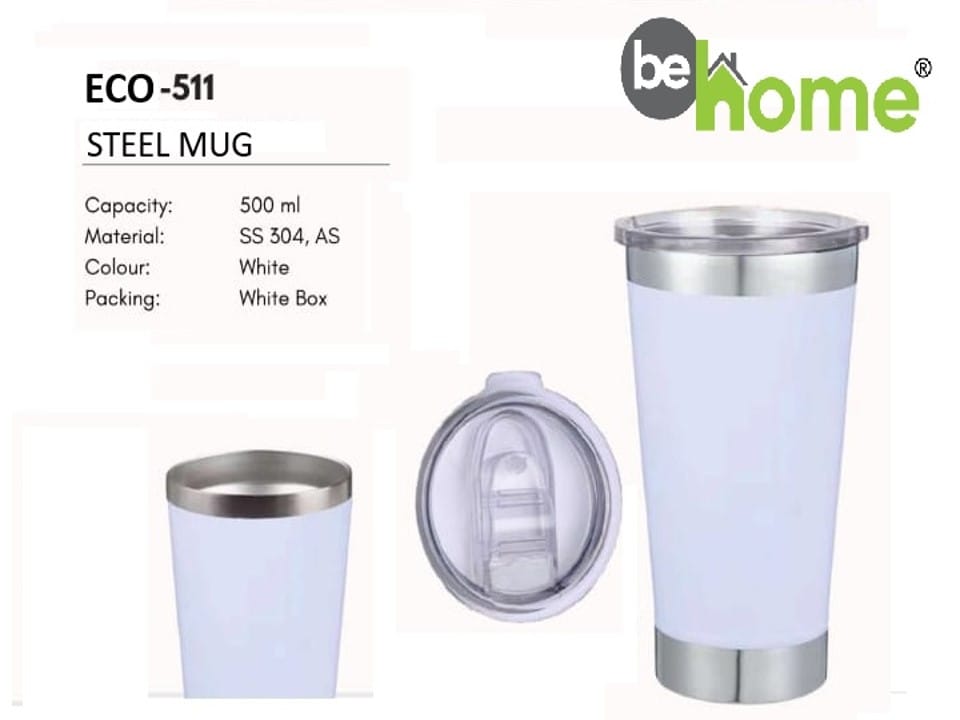 The behome ECO-511 Steel Mug is designed for style, durability, and everyday convenience. With a robust SS 304 stainless steel body and a sleek white exterior, it offers a modern look while ensuring safe and long-lasting use. Its 500 ml capacity makes it ideal for water, coffee, tea, juices, and other beverages at home, office, or during travel.