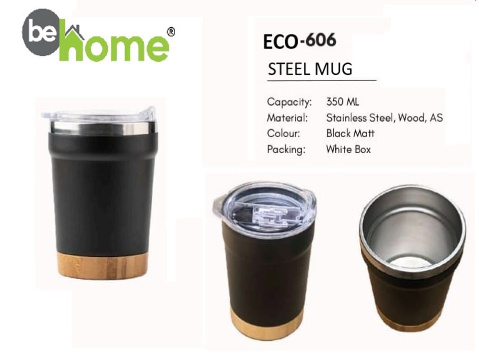 The behome ECO-606 Steel Mug 350 ml is designed with a blend of modern aesthetics and durable functionality. With a 350 ml capacity, this mug is ideal for daily beverages like tea, coffee, water, and juices—perfect for home, office, and travel use.