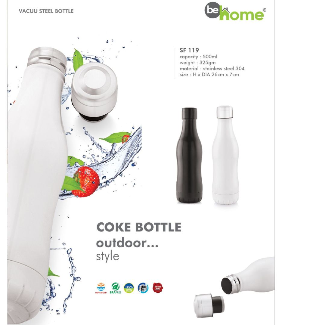 Introducing the behome Vacuum Steel Bottle-SF 119, a modern and portable hydration companion crafted for people who love style, convenience, and durability. With a 500 ml capacity and a sleek coke-bottle silhouette, it is perfect for daily use, travel, gym, or outdoor activities.