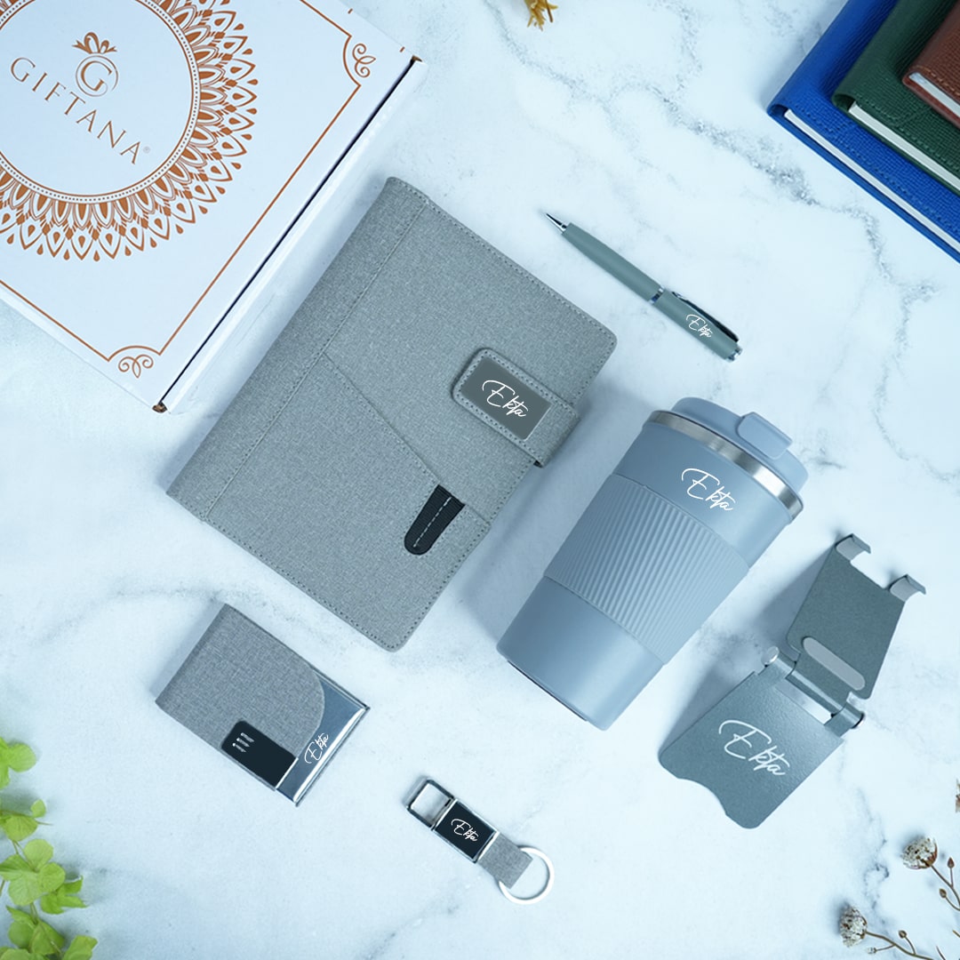 Make new employees feel valued and appreciated with our Onboarding Kit – a comprehensive package that includes everything they need to start their journey with your company. Our 6-in-1 kit includes a Metal Loop Magnet Diary, Flask Tumbler, Metal Keychain, Metal Pen, Cardholder, and Mobile Holder – all customizable to reflect your brand identity. Available in classic black, this kit is designed to make the first impression count and set the tone for a positive onboarding experience.