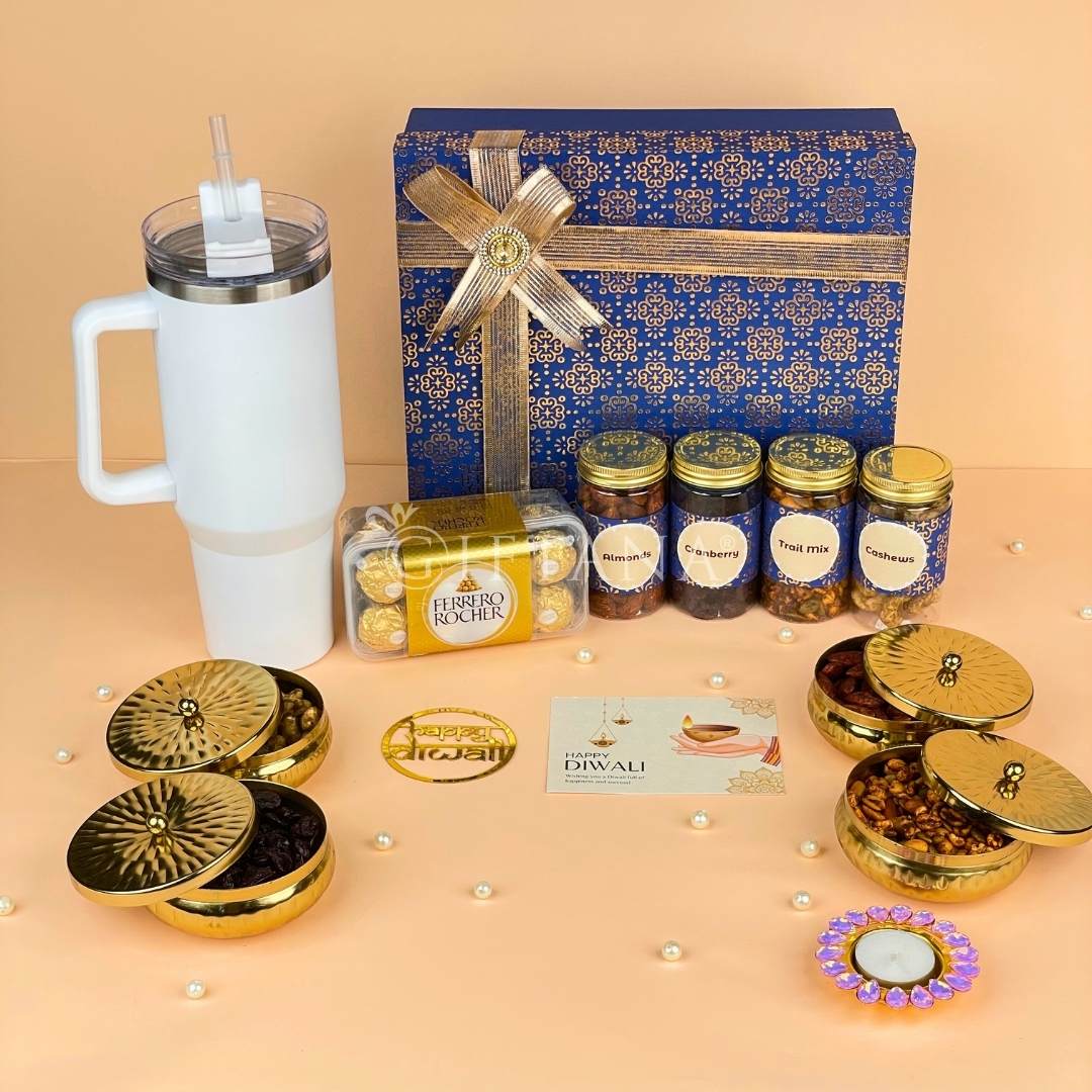 Packed with healthy dry fruits, Ferrero Rocher chocolates, and a sleek 1200ml sipper tumbler, this hamper blends tradition with modern utility, making it one of the most useful Diwali gifts for employees and business partners. Housed in a premium decorative box with a festive card and tag, it’s a gift that leaves a lasting impression.