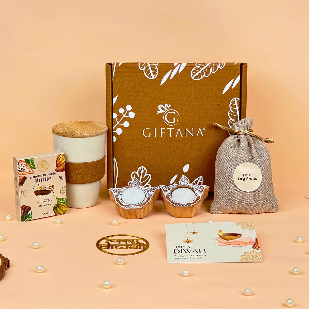 This exclusive hamper includes a 450ml eco cup, premium dry fruits, almond brownie brittle, and wooden tea light diyas for a festive touch, beautifully packed in an eco-friendly decorative box. Complete with a Happy Diwali card and tag, it’s the perfect ready-to-gift choice.