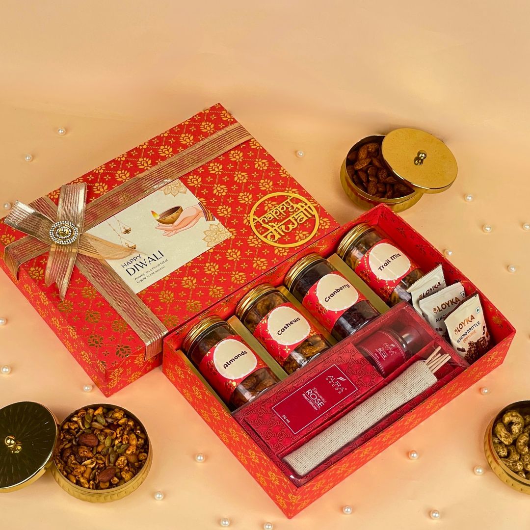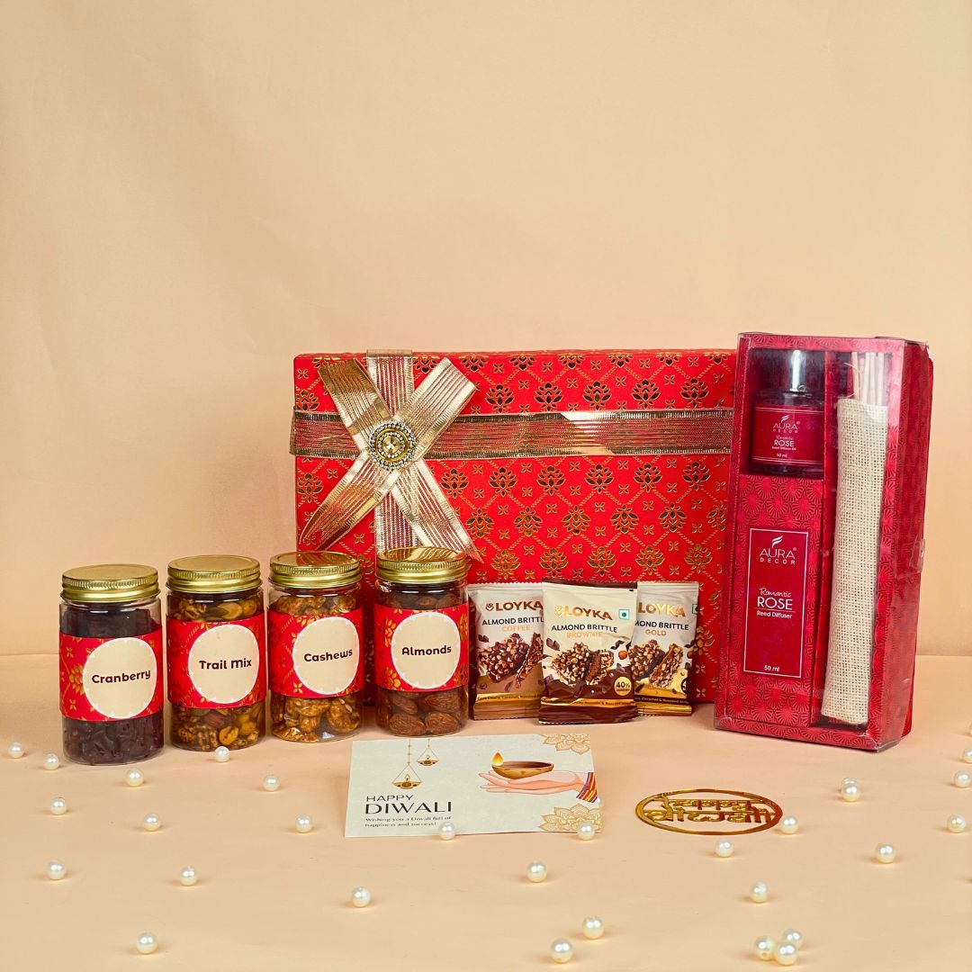 This hamper combines aromatic relaxation, healthy snacks, and sweet delights, making it the perfect choice for thoughtful Diwali gift hampers for employees and clients.