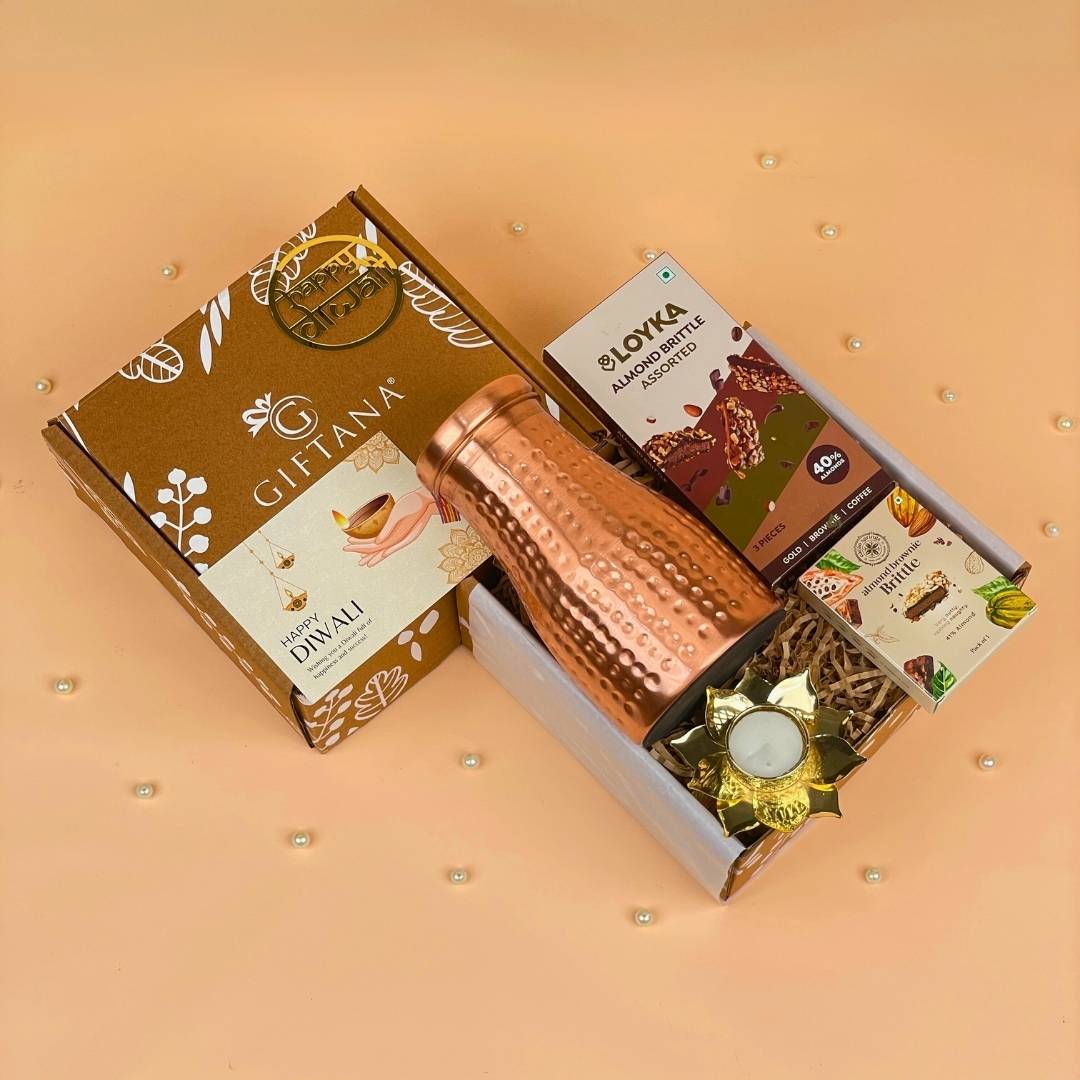 Celebrate the spirit of Diwali with elegance and tradition through the Golden Copper Glow Hamper Exclusive Diwali Gifts for Staff from GiftanaIndia. This premium festive hamper features a 1000ml handcrafted copper pot that brings health and heritage together, three pieces of assorted chocolates for a sweet indulgence, one almond brownie brittle for a rich treat, and a lotus tea light diya to illuminate the celebrations. Accompanied by a Diwali greeting card and a festive tag, all items are beautifully packed in an eco-friendly premium gift box, making it the perfect gifting choice for businesses that want to appreciate and reward their staff this festive season.