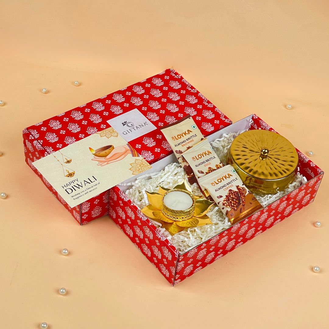 Celebrate this festive season with a thoughtful and elegant choice – the premium Diwali gifts for office employees by GiftanaIndia. Carefully curated to combine taste, tradition, and sophistication, this hamper is designed to delight staff, colleagues, and clients alike. Featuring Loyka almond brittle (3 pcs), a reusable lotus metal diya with T-light candle holder, 100g of premium dry fruits in a stylish metal jar, and a beautifully crafted Diwali greeting card, it perfectly balances wellness, sweetness, and cultural symbolism. Ideal for bulk corporate orders, this hamper adds value to employee appreciation programs while strengthening professional relationships.