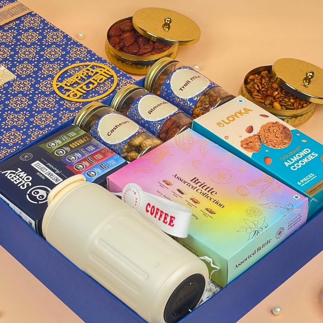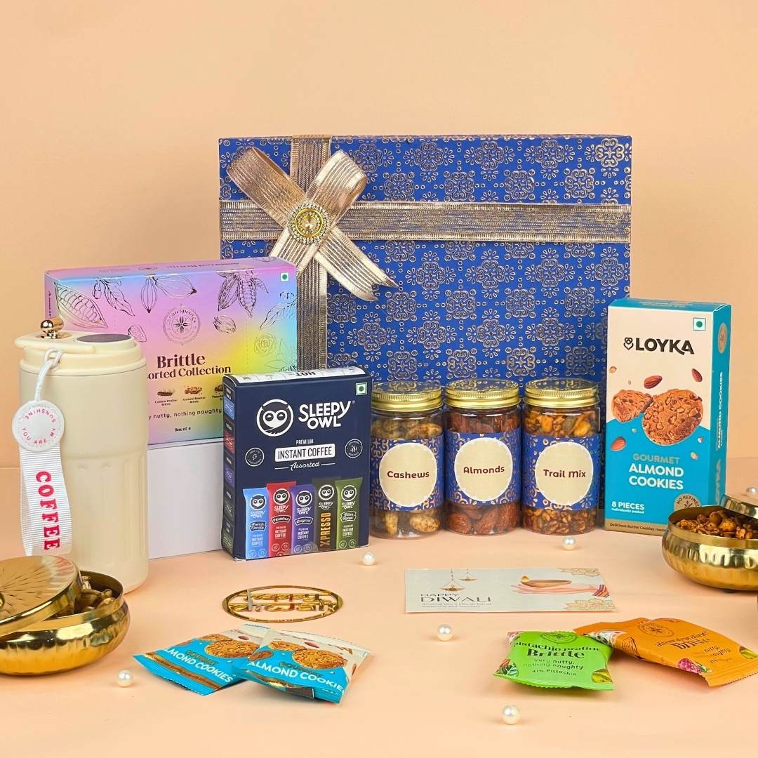 This premium gift set includes a 500ml Smart Temperature Tumbler, Assorted Flavored Coffee, 100gm Flavored Cashews, 100gm Flavored Almonds, 100gm Flavored Trail Mix, Brittle Assorted 4pcs, Almond Cookies 8pcs, Happy Diwali Card, all beautifully packed in a Premium Decorative Box.
