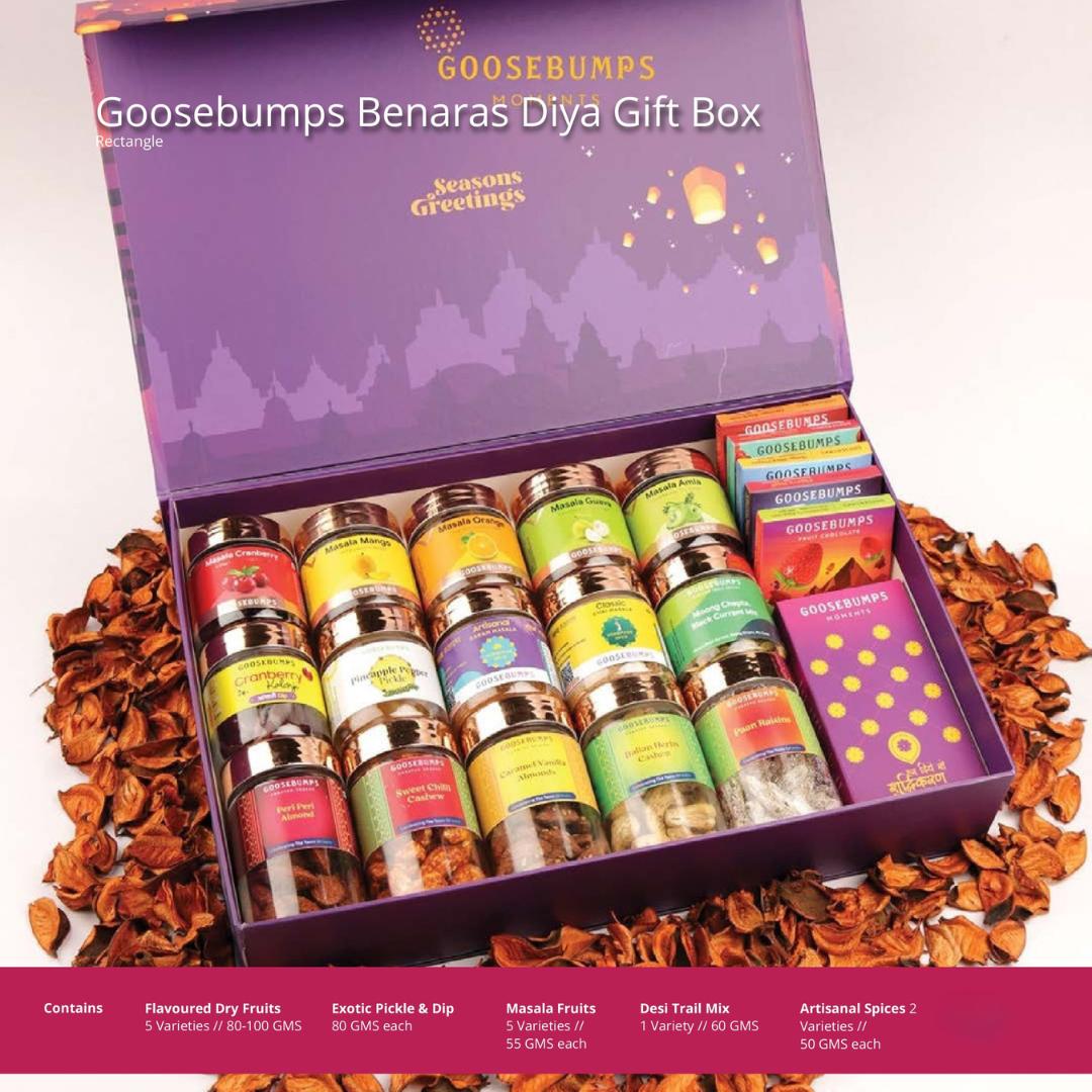 Discover the vibrant essence of India with the Goosebumps Benaras Diya Gift Box – Premium Indian Gourmet Gift Hamper, a beautifully curated hamper perfect for festive and corporate gifting. Inspired by the rich flavors of Benaras, this luxurious gift box brings together tradition, wellness, and indulgence in one unforgettable experience.