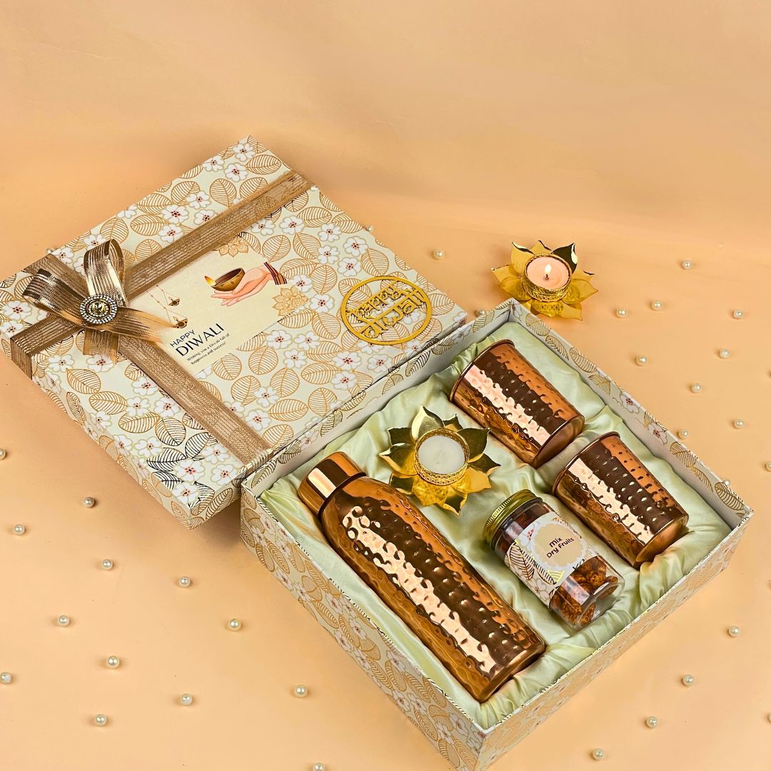 Celebrate the festival of lights in traditional elegance with the Radiant Copper Hamper Diwali Gifts with Bottle and Glasses from GiftanaIndia. This thoughtfully designed hamper features a premium copper bottle paired with two copper glasses, bringing a touch of heritage and health benefits to your festive gifting. The set is further enhanced with 100g of mixed dry fruits for a wholesome treat, a lotus tea light diya for a festive glow, and a Diwali greeting card with a decorative tag. Packed in a premium gift box, this hamper is ideal for businesses seeking meaningful and stylish Diwali gifts for employees, clients, and corporate partners.