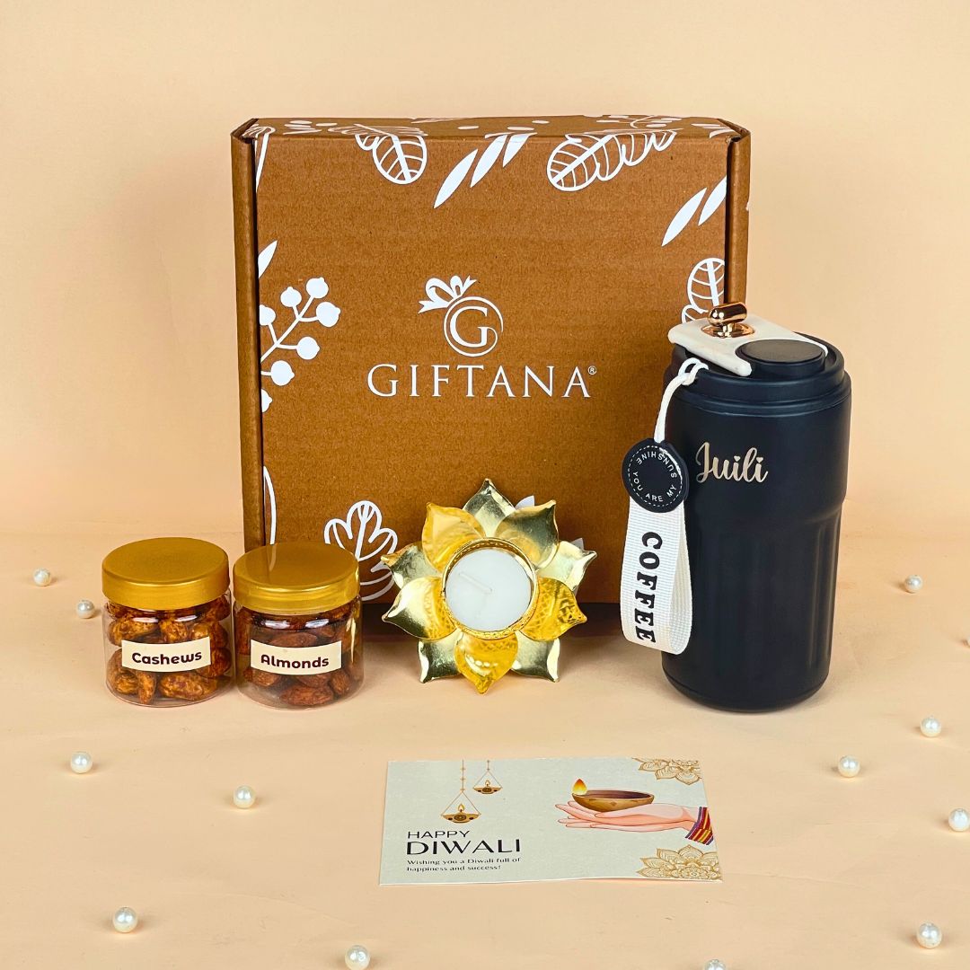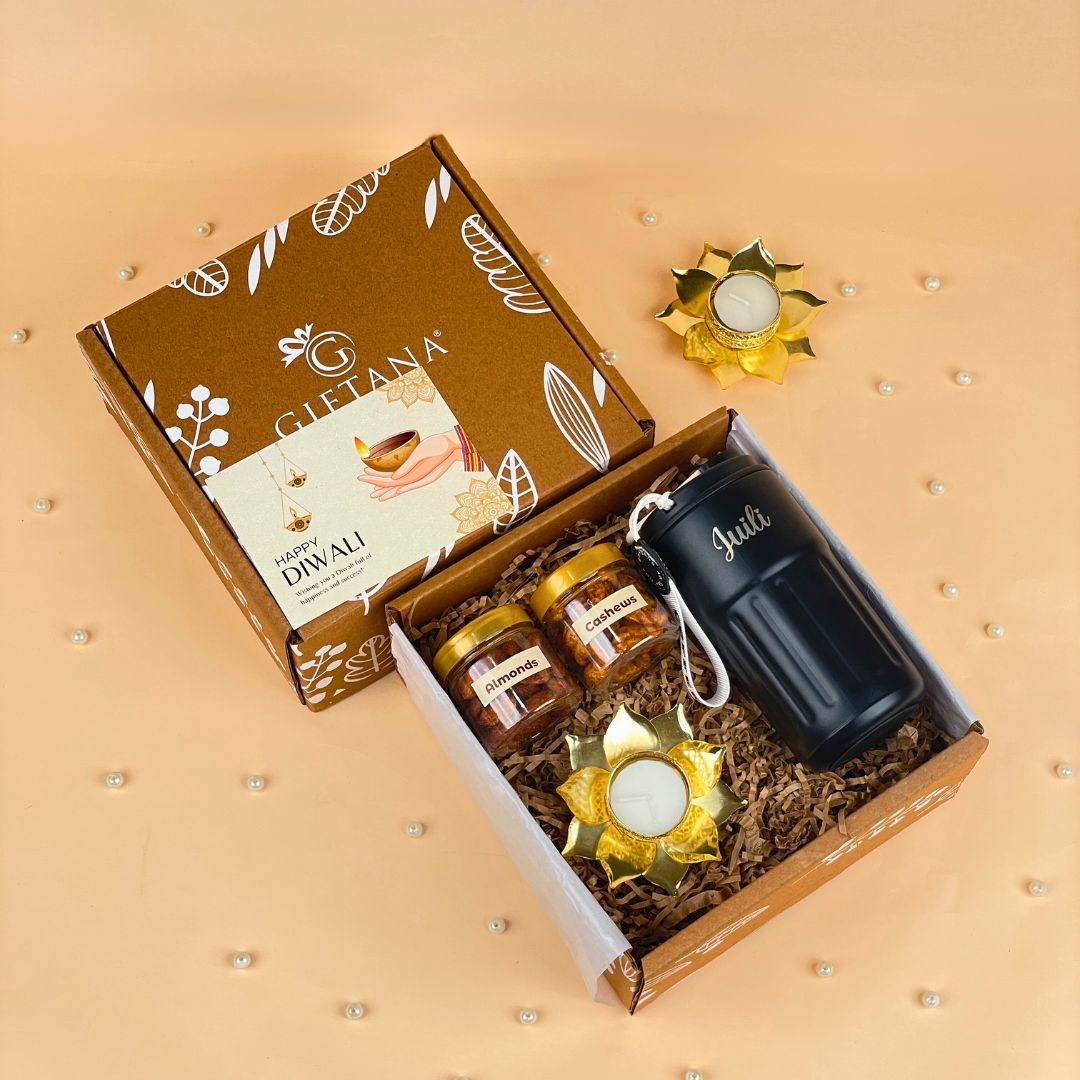 Celebrate the festival of lights with the Smart Sip Hamper Diwali Gifting Solution for Employees and Clients from GiftanaIndia, designed to offer a perfect blend of innovation, health, and festive charm. This thoughtfully curated hamper features a sleek smart temperature tumbler that keeps beverages at the ideal temperature, 50g of flavored cashews, 50g of flavored almonds, an elegant lotus tea light diya, and a greeting card to share warm Diwali wishes. Packed in an eco-friendly gift box, it’s an excellent choice for companies seeking meaningful Diwali gifting solutions that impress employees and strengthen client relationships.