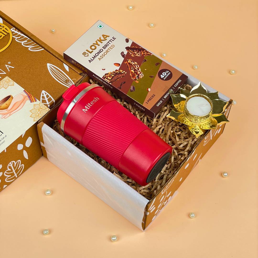 Celebrate the joy of Diwali with the Travel Mug Gift Set Diwali Unique Gifts for Employees with Chocolates from GiftanaIndia, designed to combine style, functionality, and festive charm. This thoughtfully curated hamper features a premium coffee tumbler for everyday use, delectable assorted chocolates for a sweet treat, a lotus tea light diya to brighten festive moments, and a greeting card to share heartfelt wishes. Packaged in an eco-friendly gift box, it is perfect for companies seeking a sustainable and impressive Diwali gifting solution that shows appreciation to their hardworking employees.