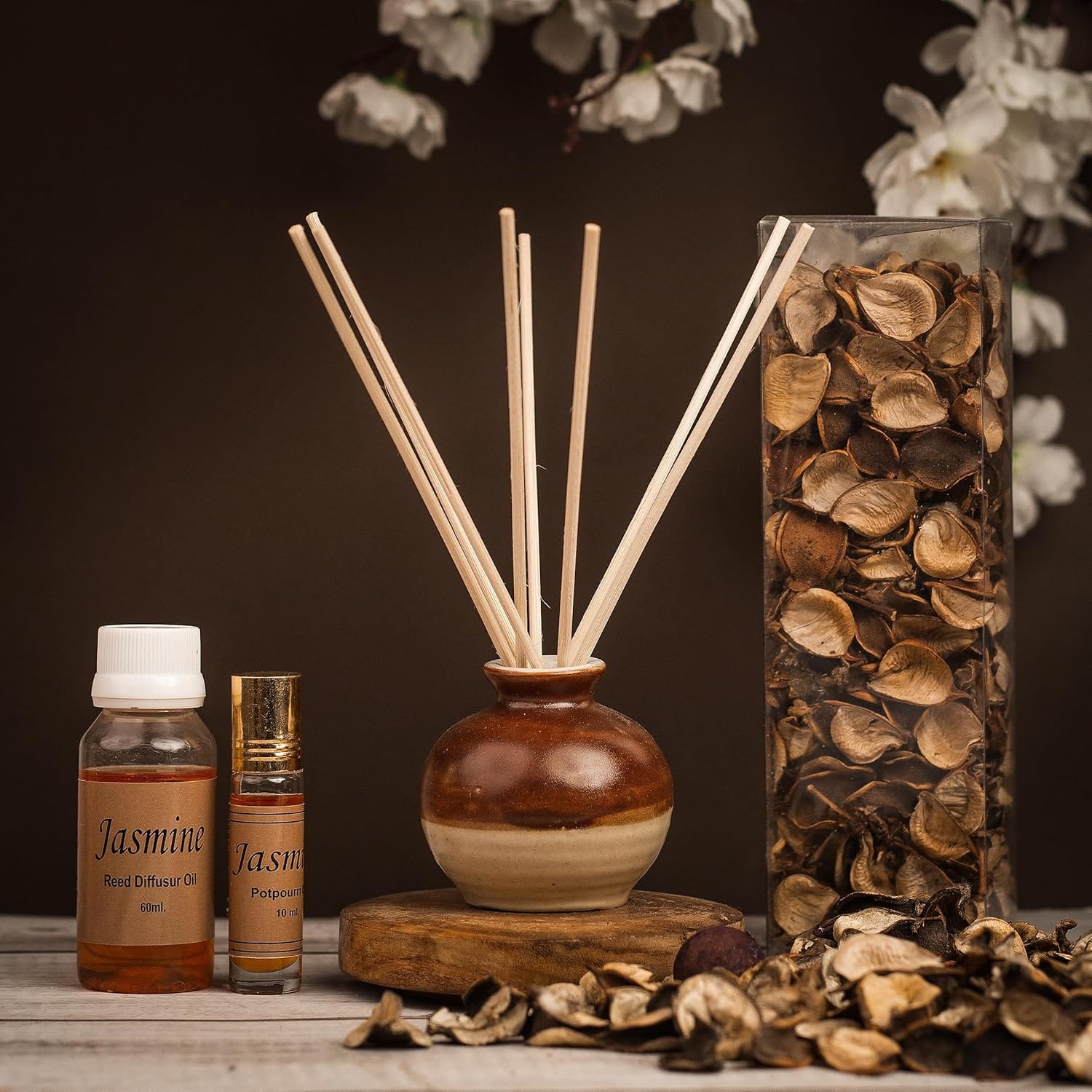 The reed diffuser gently releases long-lasting fragrance through high-quality reeds, while the potpourri adds a decorative touch with its aromatic botanical blend. Together, they create a soothing, refreshing ambience ideal for homes, offices, spas, and relaxation corners.