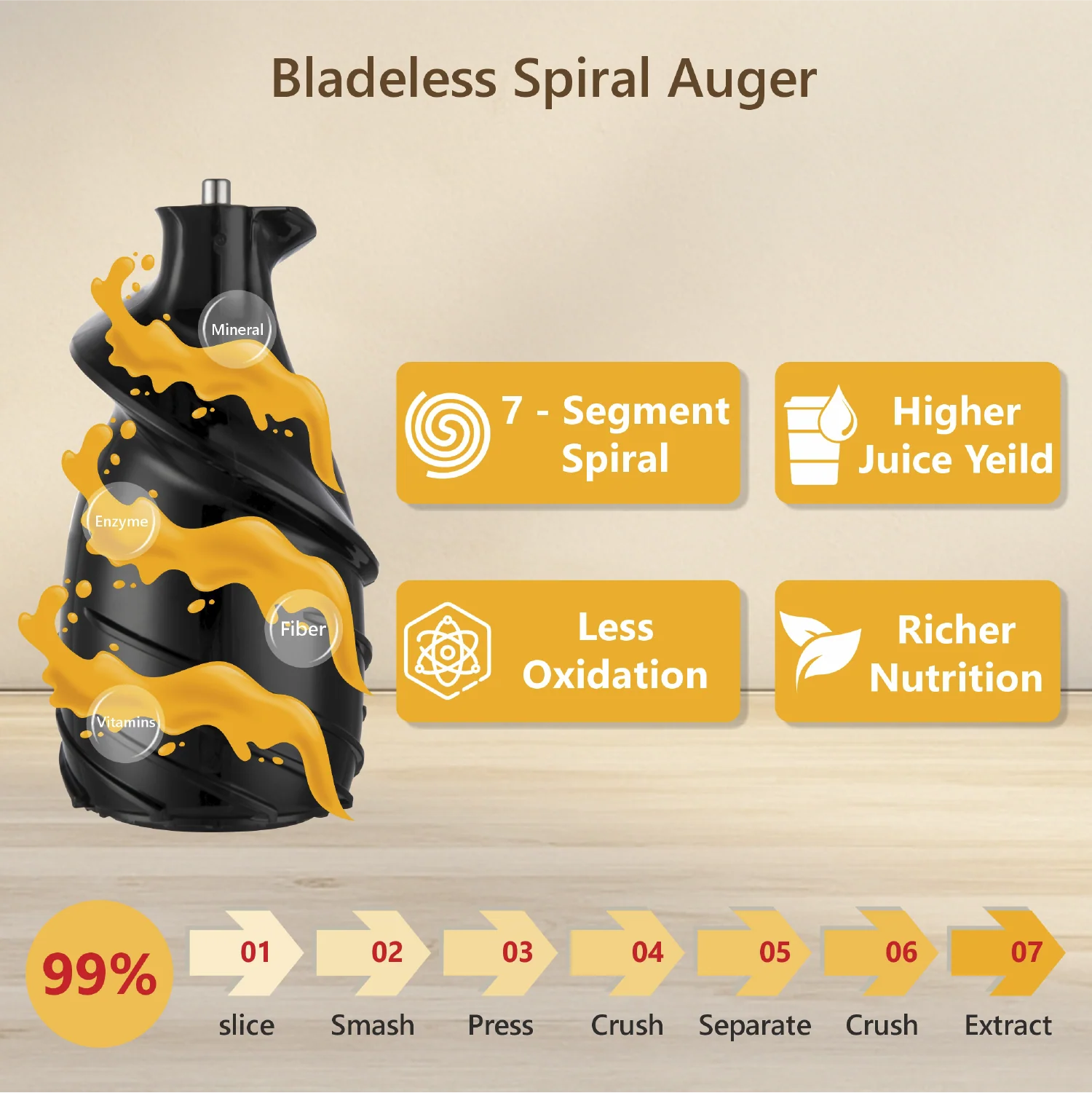 High Juice Yield with minimal oxidation.