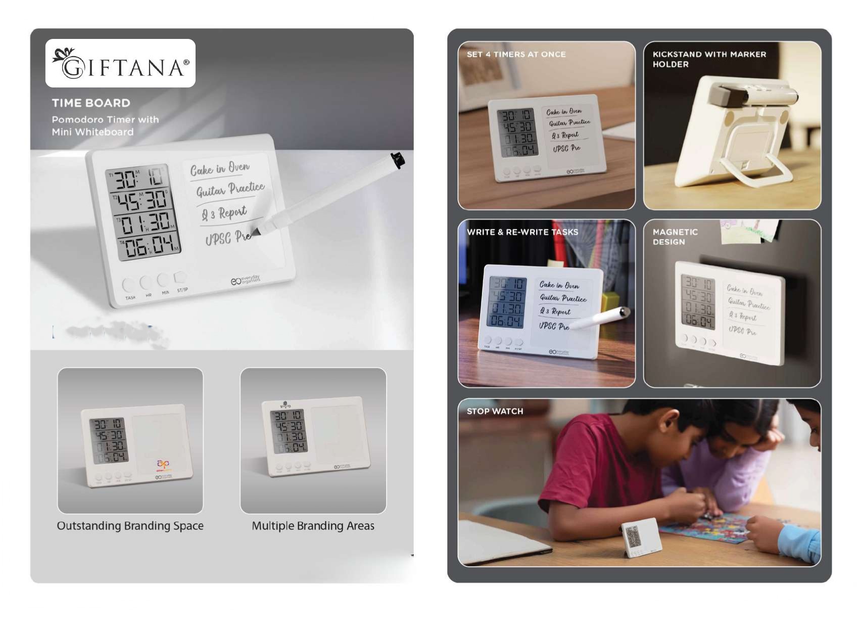 Smart productivity desk timer featuring 4 simultaneous timers, mini whiteboard, stopwatch, kickstand, and magnetic design. Ideal for offices, study desks, employee gifting, training programs, and branded corporate giveaways focused on productivity and organization.