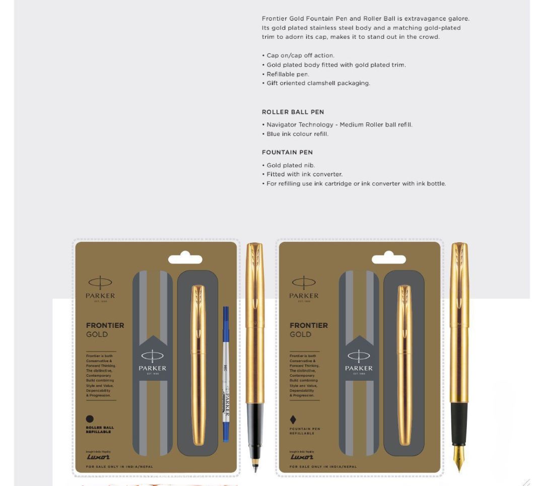 The Parker Frontier Gold Fountain Pen and Roller Ball Pen Set represents refined luxury combined with dependable writing performance, making it a preferred choice for premium corporate gifting and professional stationery programs. Crafted with a gold-plated stainless steel body and coordinated gold trim, both pens deliver an elegant, high-value appearance suitable for executive use and formal business environments.