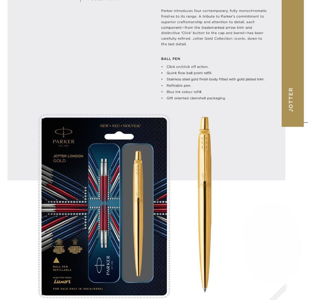 he Parker Jotter London Gold Ball Pen represents refined luxury and timeless craftsmanship, designed for professionals who value elegance in everyday writing. Featuring a fully monochromatic gold-finish stainless-steel body, this pen embodies Parker’s signature sophistication. Every detail-from the iconic arrow clip to the precise “Click” button mechanism-has been carefully crafted for durability, smooth functionality, and an elevated writing experience. Equipped with a Quinkflow ball point refill, the pen delivers clean, consistent, and reliable writing suitable for signatures, daily documentation, meetings, and executive-level use. Its refillable nature adds long-term value for corporate procurement. Presented in premium clamshell packaging, the Jotter London Gold is ideal for leadership gifting, corporate events, luxury onboarding kits, and premium stationery hampers. A perfect blend of design excellence and professional appeal, this pen stands out as a premium choice for high-end corporate gifting.