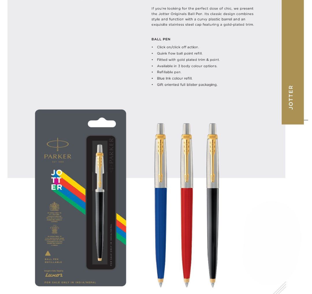 The Parker Jotter Originals Ball Pen with Gold Trim delivers timeless design combined with everyday writing reliability, making it ideal for large-scale corporate procurement and professional gifting. Featuring a curvy plastic barrel paired with a premium stainless-steel cap fitted with gold-plated trim and point, the pen offers a stylish yet durable build suitable for executive and office use. The click-on/click-off mechanism ensures smooth operation, while the Quinkflow ball point refill provides consistent, clear, and fast-writing performance-perfect for meetings, note-taking, documentation, and employee kits. Available in three attractive body colors, the pen supports branding flexibility for gifting, events, induction programs, and promotional campaigns. The refillable system ensures long-term cost efficiency, and the blue ink output meets corporate writing standards. Each pen comes in a gift-oriented full blister pack, making it a strong choice for conference giveaways, welcome kits, and premium office stationery assortments.