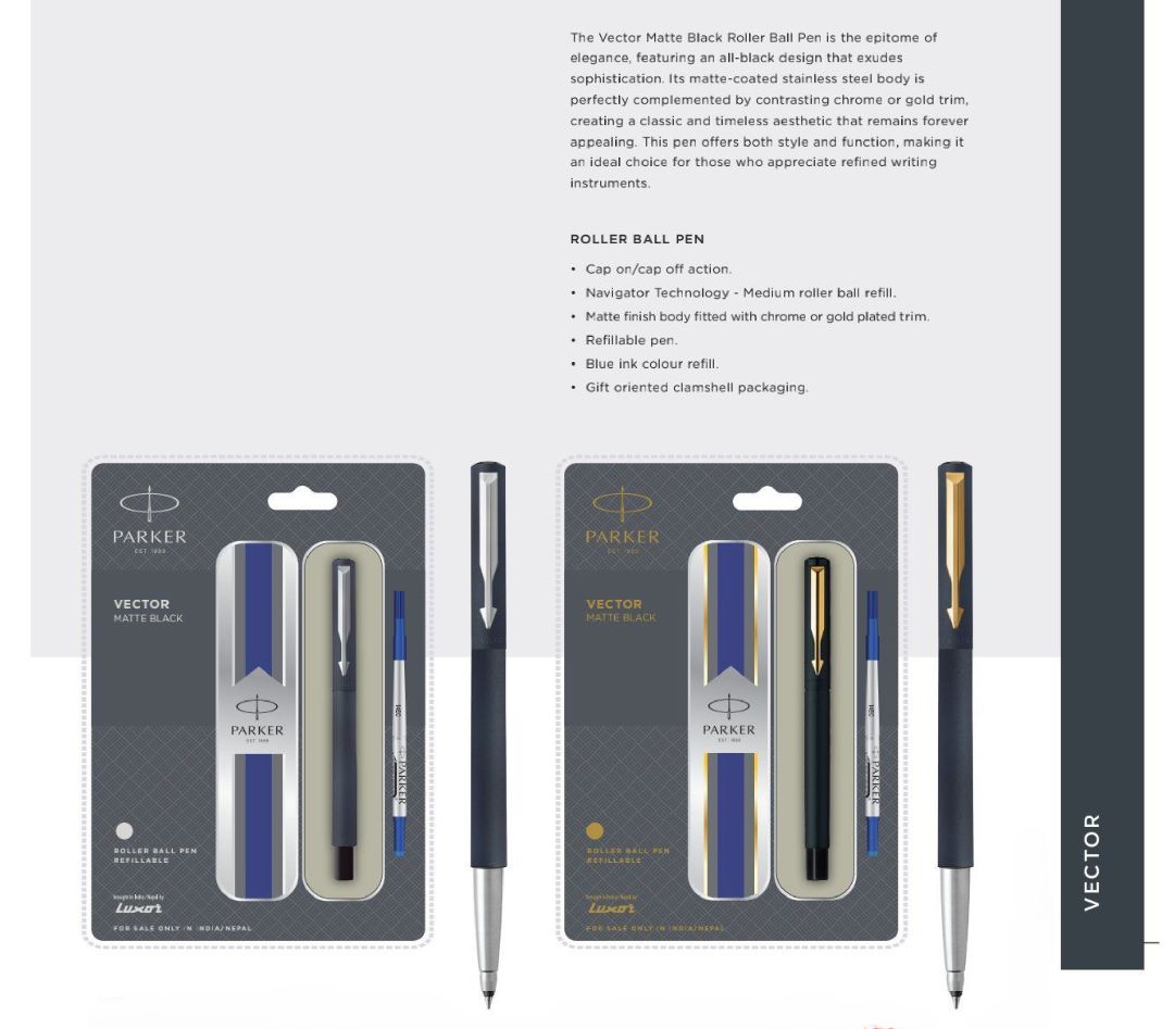 The Parker Vector Matte Black Roller Ball Pen is designed for professionals seeking understated elegance combined with dependable writing performance. Its matte-finished body offers a firm grip and a refined appearance suited for business meetings, documentation, and daily professional use.