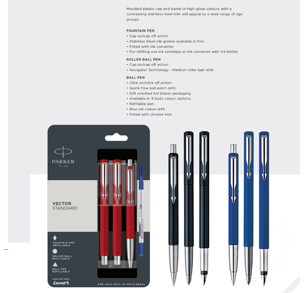 The Parker Vector Standard Ball Pen, Roller Ball Pen and Fountain Pen Set is a versatile professional writing solution designed for organisations that value functionality, durability, and trusted brand presence. This three-pen combination brings together a ball pen, roller ball pen, and fountain pen, making it ideal for structured corporate stationery programs and premium onboarding kits.