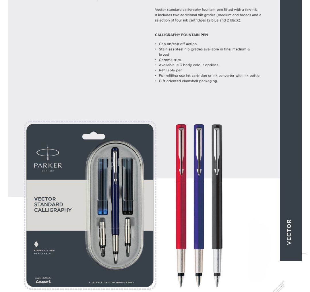 The Parker Vector Standard Calligraphy Fountain Pen is a versatile writing instrument developed for calligraphy, creative lettering, and professional writing applications. Built with a durable high-gloss plastic barrel and chrome trim, this fountain pen delivers consistent performance suitable for repeated use in educational and professional environments.