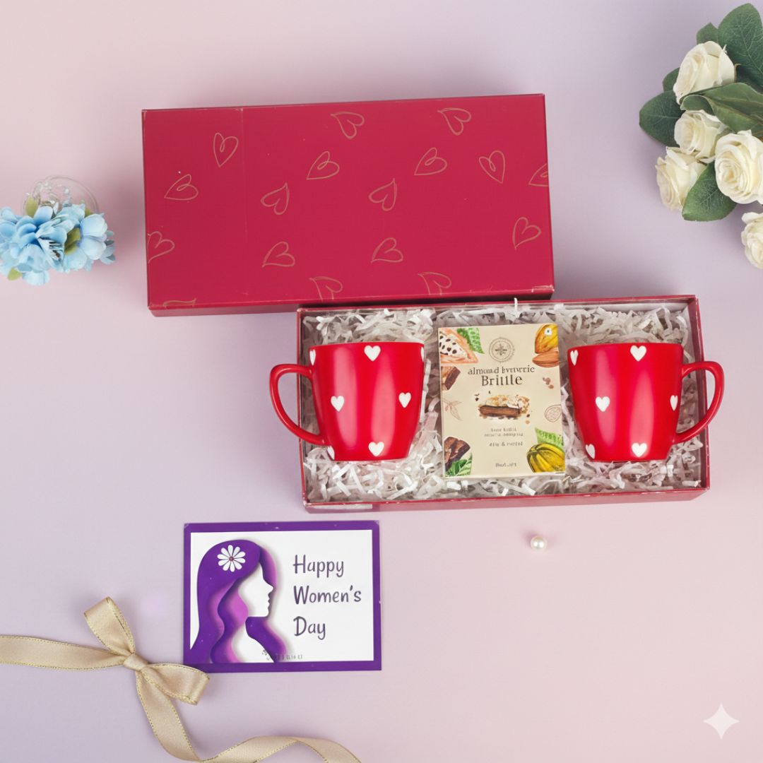 The Happy Women’s Day Premium Couple Mug Gift Set is thoughtfully curated for structured Women’s Day corporate gifting programs focused on appreciation and recognition. Designed to reflect warmth, gratitude, and meaningful acknowledgment, this premium gift set combines elegant red heart mugs with a refined cacao pairing and a formal greeting presentation.